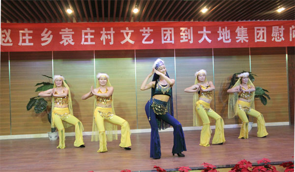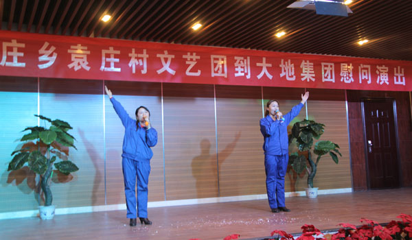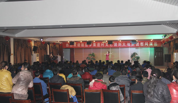 为活跃职工的文化生活,赵庄乡袁庄村文艺团受大地集团之邀,2012年12月8日晚到大地公司友情演出。县总工会主席郭鹏飞、县政府党组成员曲延辉、县政府办副主任李学敏、赵庄乡袁庄村党委书记袁军国应邀到场观看,大地集团领导及职工200多人兴致勃勃地观看了演出。 宝丰县的民间演出团体享誉省内外,被誉为“曲艺之乡”,袁庄村的文艺团就是其中的一支奇葩。演员们声情并茂,绘声绘色的演出令人久久回味,独唱、舞蹈、魔术等富有民间色彩的优秀文艺节目,赢得了观众的阵阵掌声。在丰富职工业余文化生活的同时,也增强了企地间的文化交流和友谊。